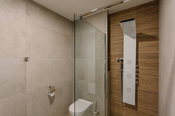 Rez-de-chaussée : un séjour lumineux et chaleureux avec de grandes fenêtres donnant sur une terrasse privative, une cuisine américaine entièrement équipée, une chambre double confortable et une salle de bains moderne avec une douche spacieuse.