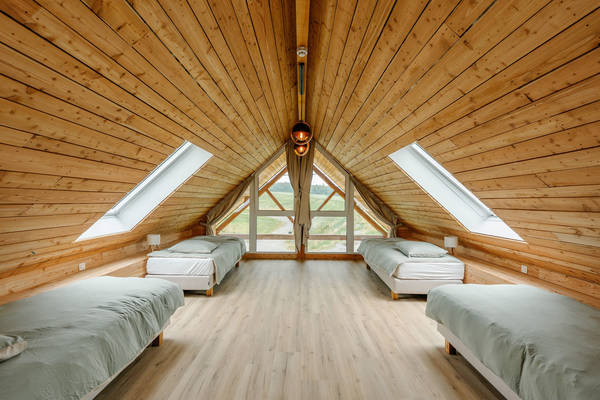 À l’étage : une grande chambre avec quatre lits (agencement modulable pour plus d’intimité) et une chambre supplémentaire pour deux personnes.