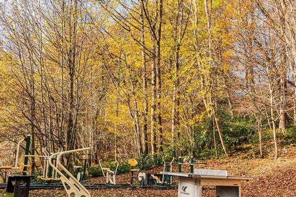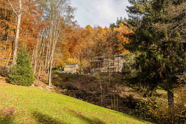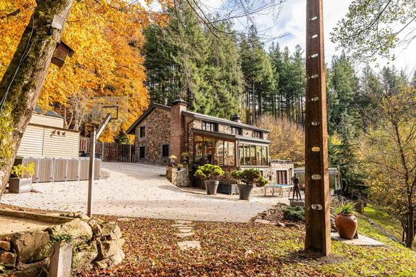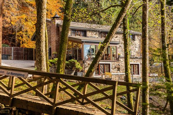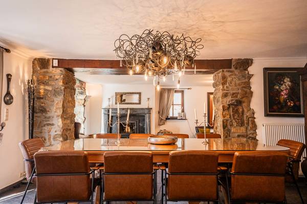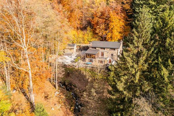 Cette maison de vacances est située dans un jardin clos d'un hectare traversé par la petite rivière Le Nonnonruy et sa cascade. À l'extérieur, vous trouverez de grandes terrasses panoramiques avec de grandes tables de jardin et un coin salon confortable avec une cheminée. Il y a, en plus de la piscine avec douche extérieure et chaises longues, également un sauna avec poêle à bois et vue sur le jardin, deux barbecues (bois et charbon), un coin jeux et balançoires avec brasero et de nombreuses possibilités de sports et de jeux. Des places de parking pavées sont également prévues.
